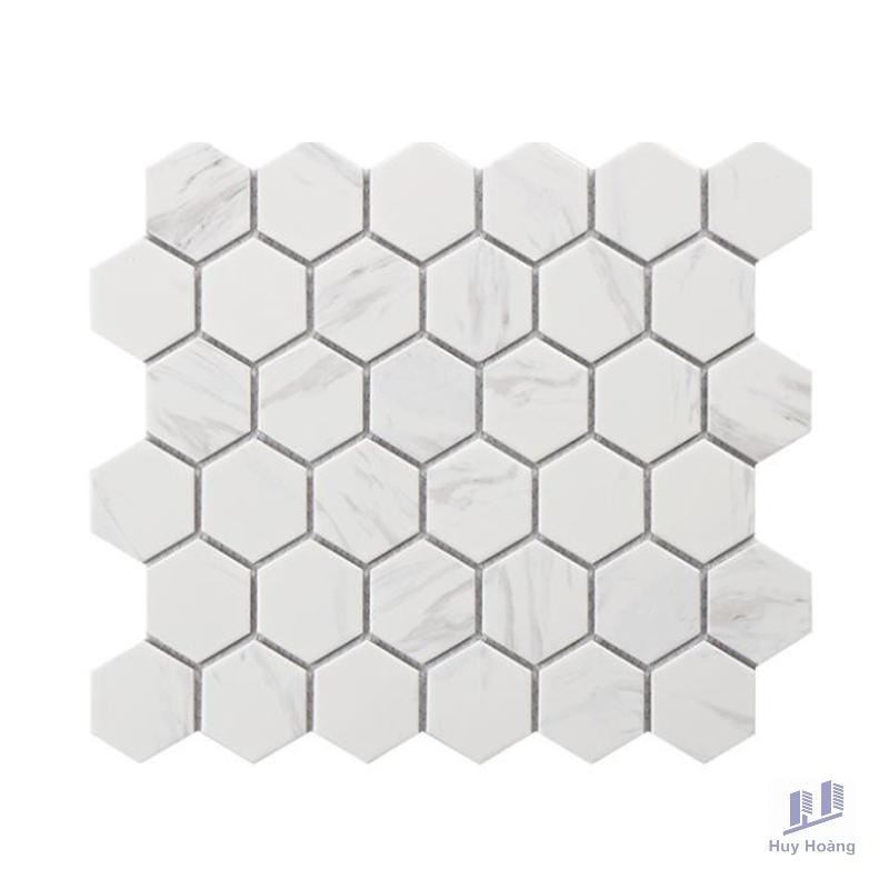 Size: 330x280mm/vỉ, 48x56mm/viênChất liệu: PorcelainBề mặt: Mosaic lục giác carraraĐộ hút nước: <0.05%Ứng dụng: Trang trí cho tường Mosaic là một sáng