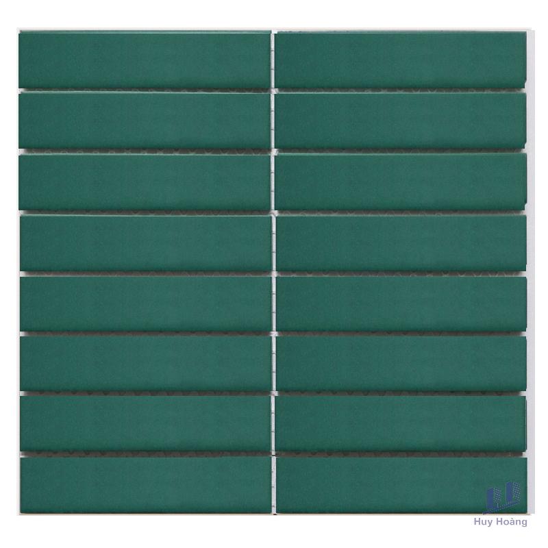 Size: 275x290mm/vỉ, 32x145mm/viênChất liệu: PorcelainBề mặt: Mosaic thanh nhỏ / Xanh lá đậm mờĐộ hút nước: <0.05%Ứng dụng: Trang trí cho tường Mosaic